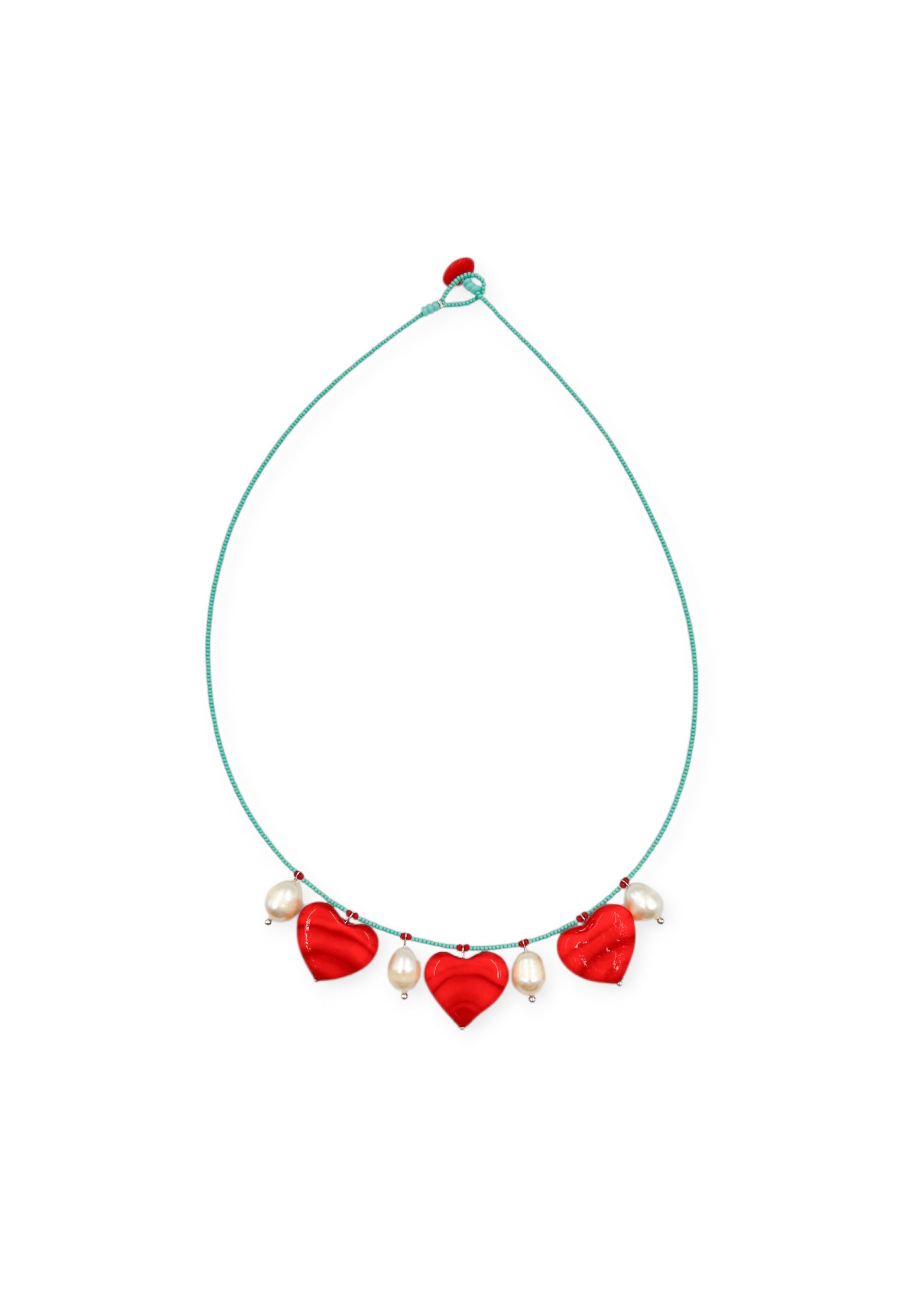 Colar curto, corações de vidro modelado no fogo, pérola natural e micro miçangas de vidro da Republica Tcheca.