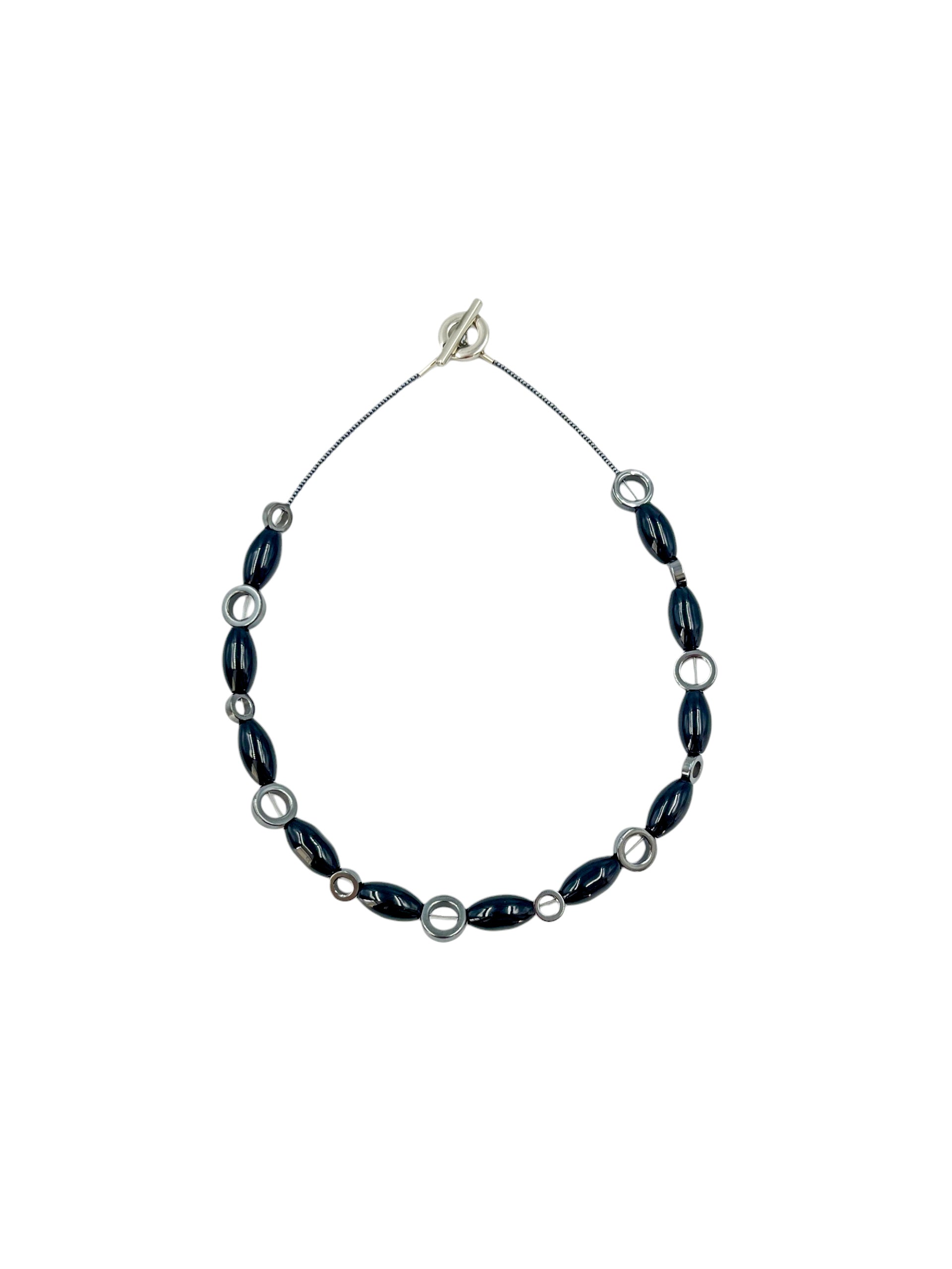 Colar curto, miçangas de vidro grafite, círculos de hematita natural e barris de vidro.