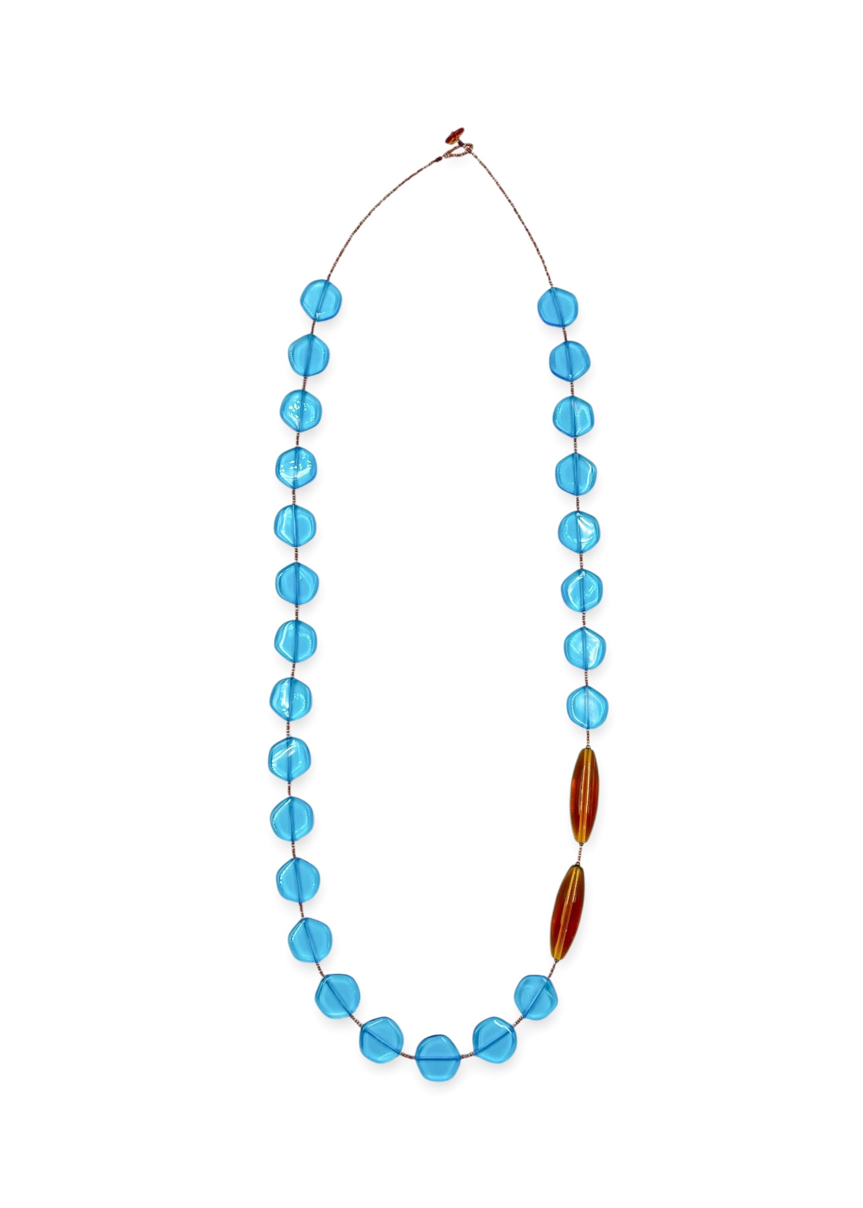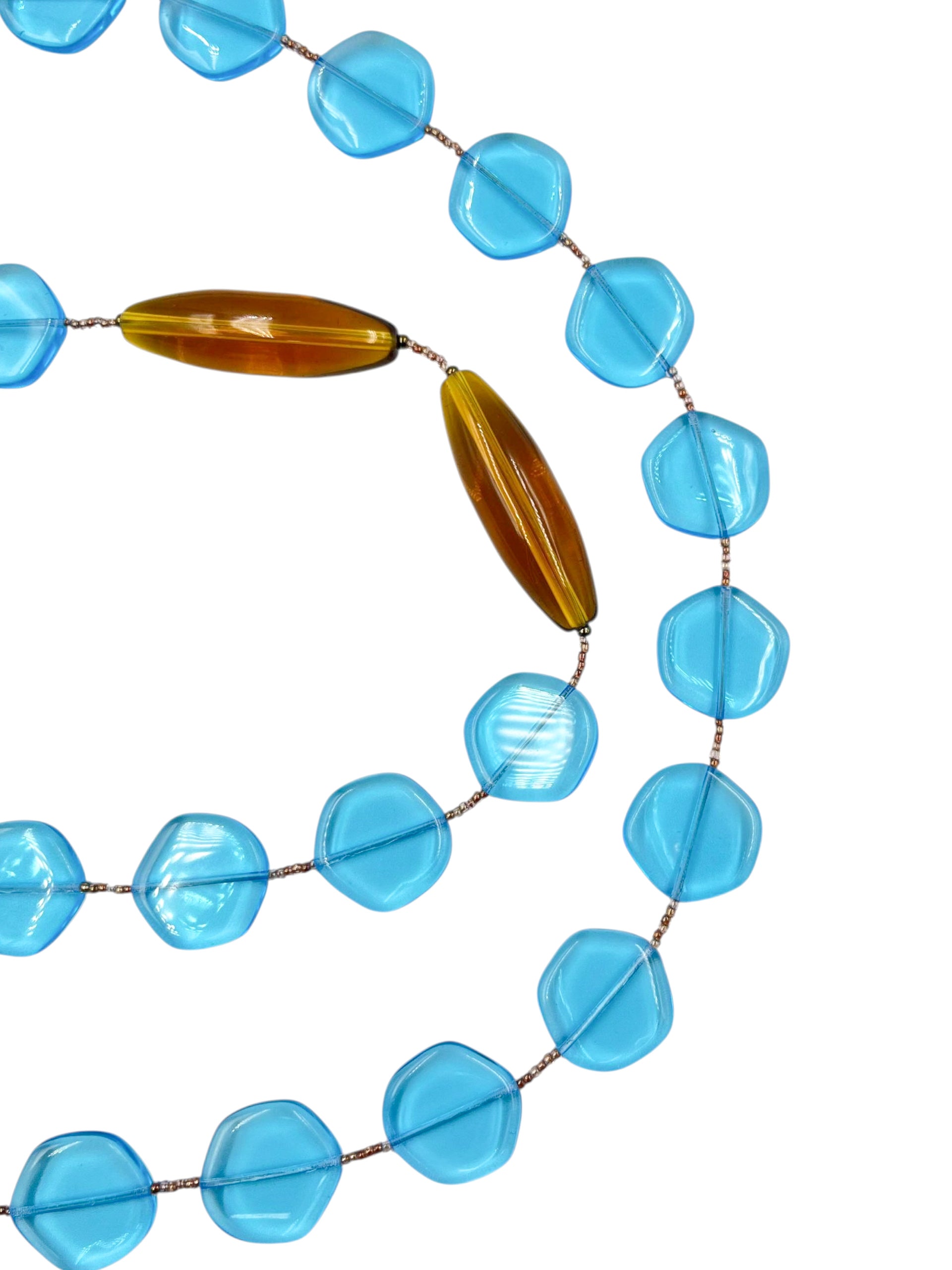 Colar longo, nas cores azul e detalhe caramelo, contas e miçangas de vidro.