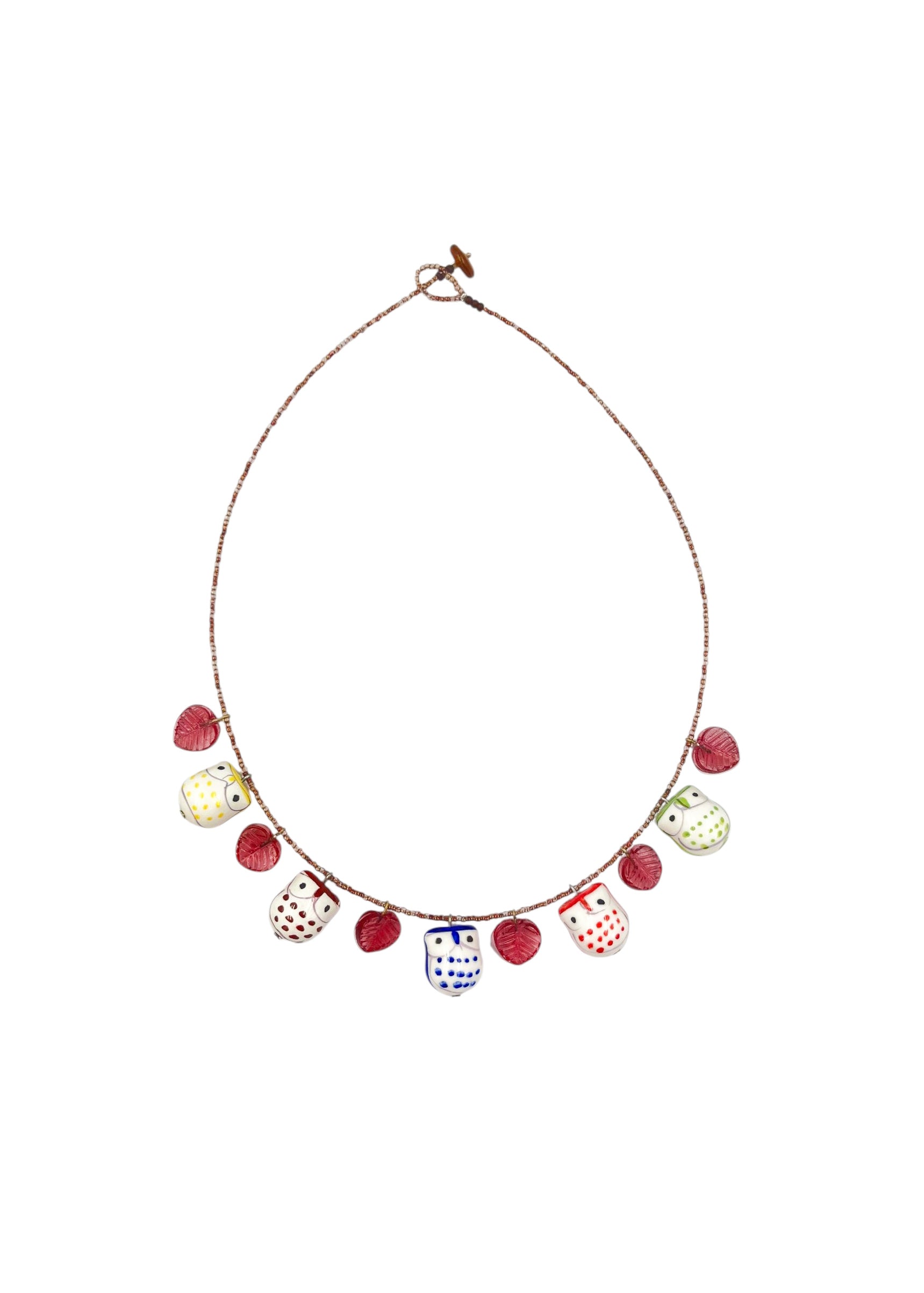 Colar lúdico, curto, miçangas e pétalas de vidro rose, corujas de porcelana pintadas a mão.