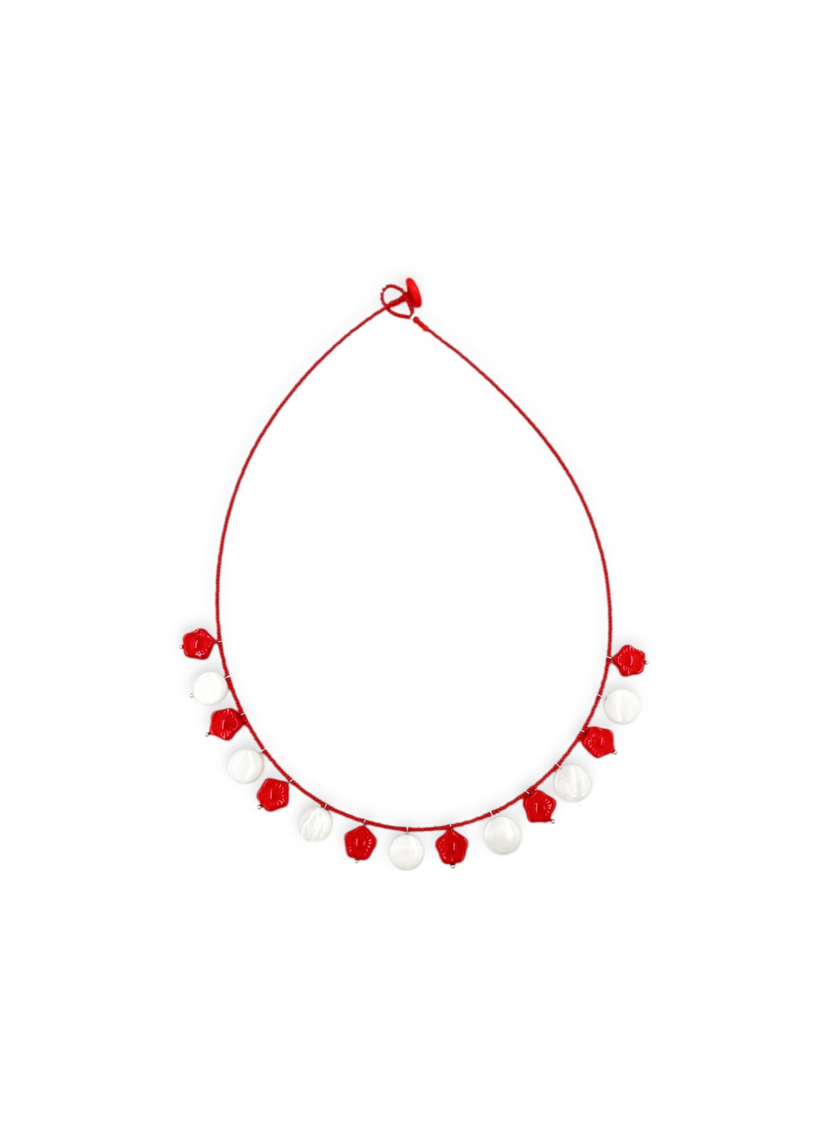 Colar curto, miçangas e flores de vidro, madrepérola natural e fecho de botão em vidro.