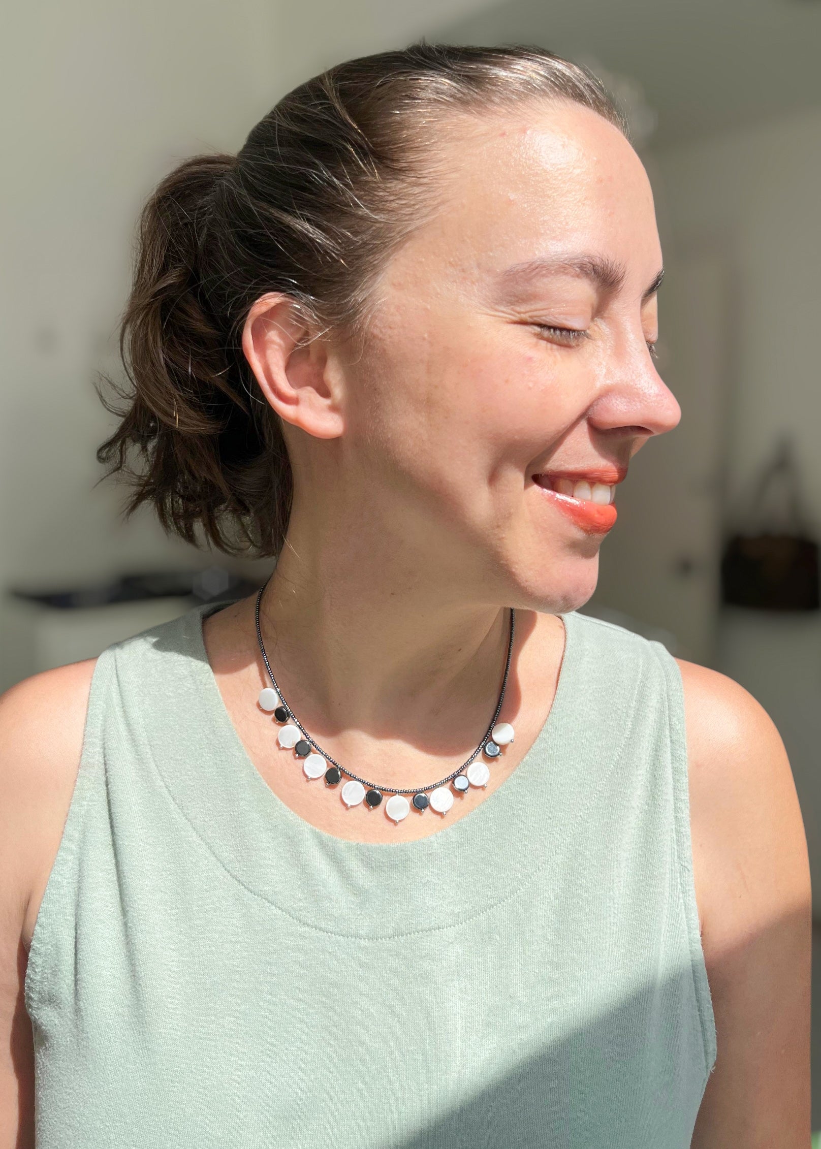 Colar curto, moedinhas de madrepérola, hematita e miçangas transparentes.