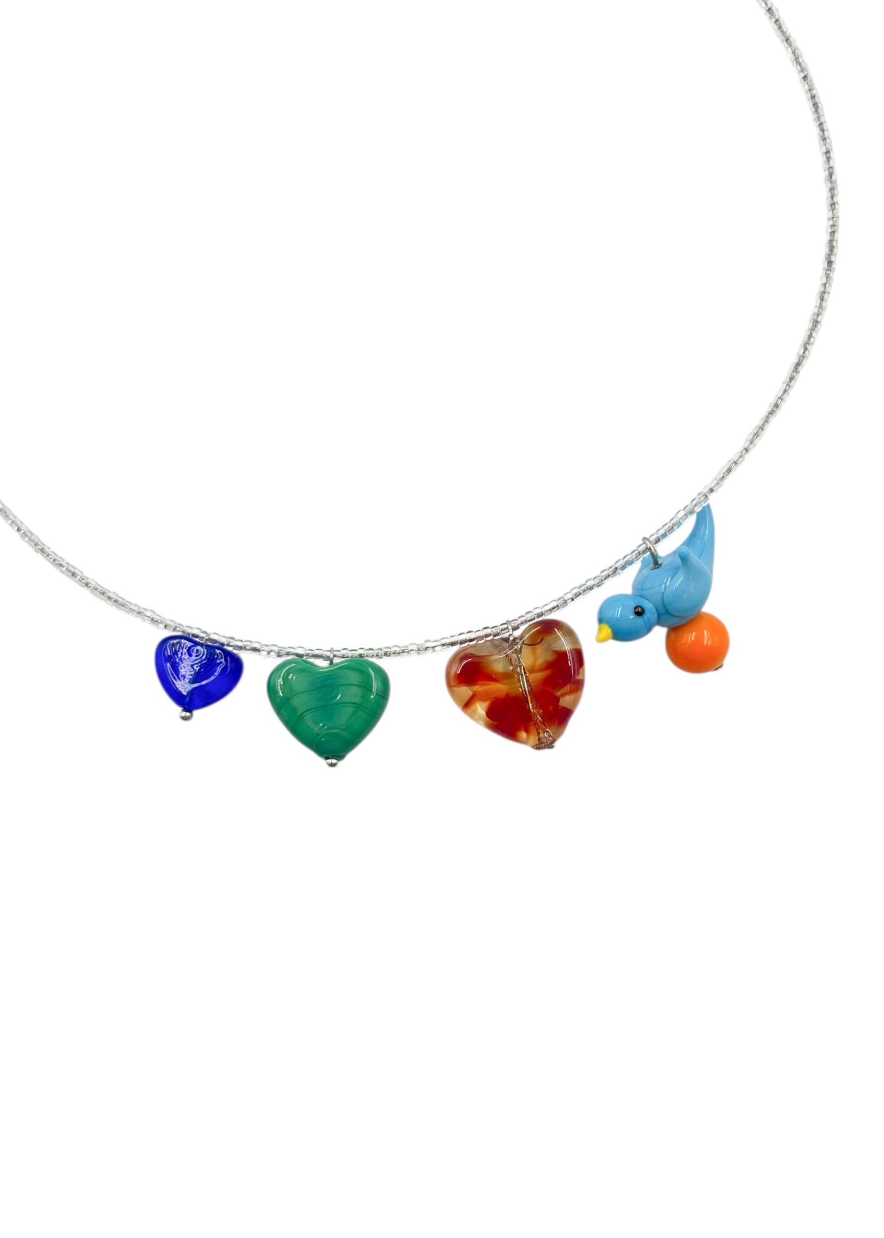Passarinho e coraçõezinhos de vidro modelado no fogo e micro miçangas da República Tcheca.