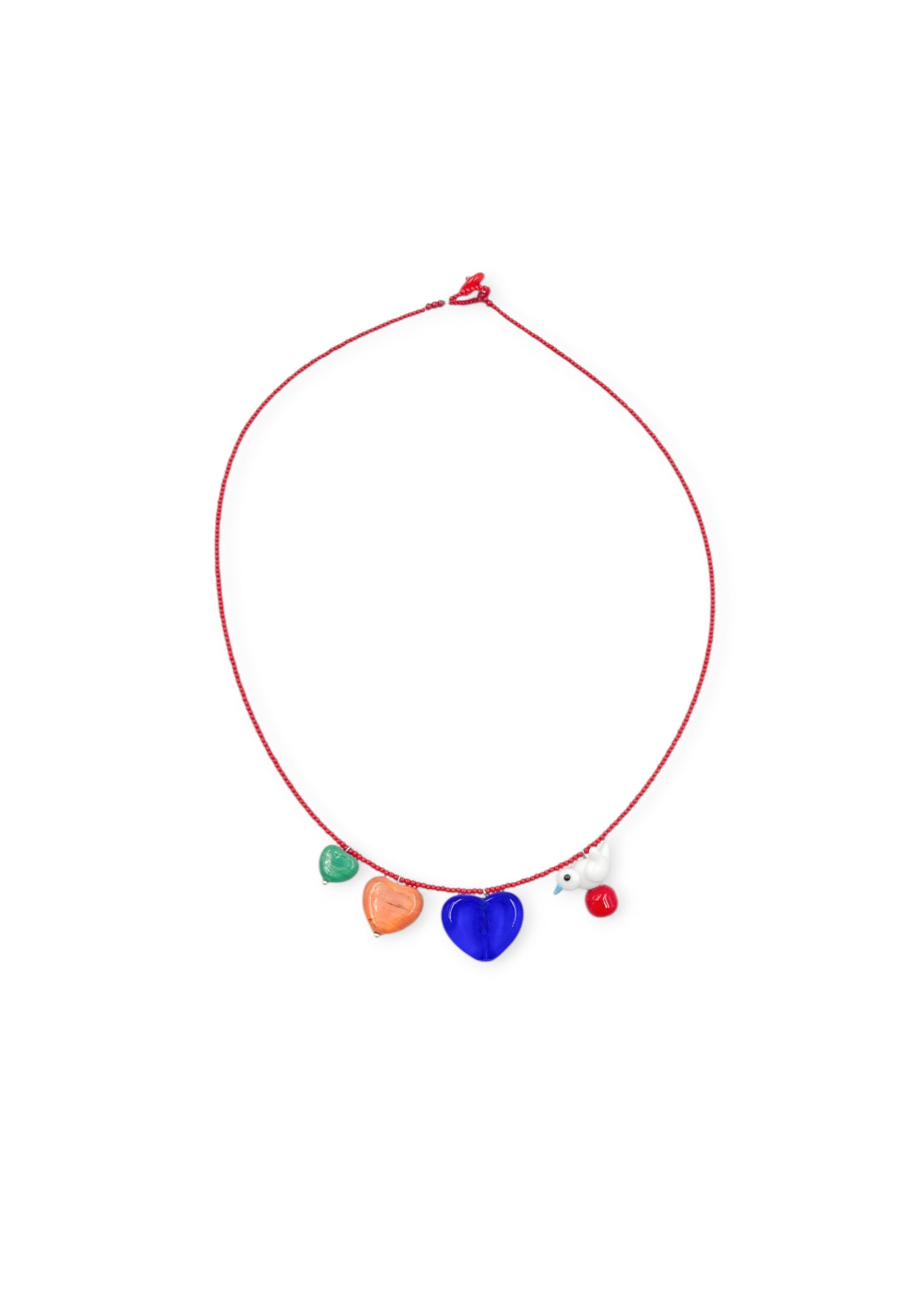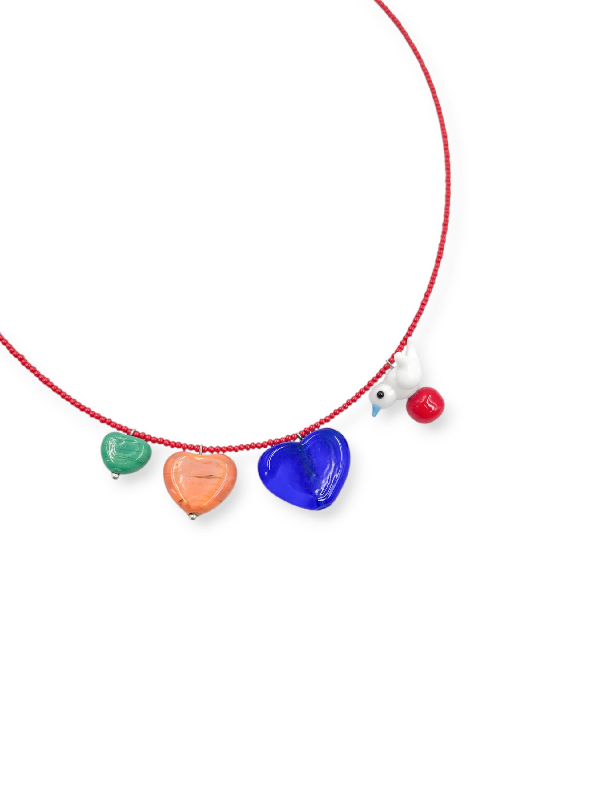 Passarinho e coraçõezinhos de vidro modelado no fogo e micro miçangas da República Tcheca.