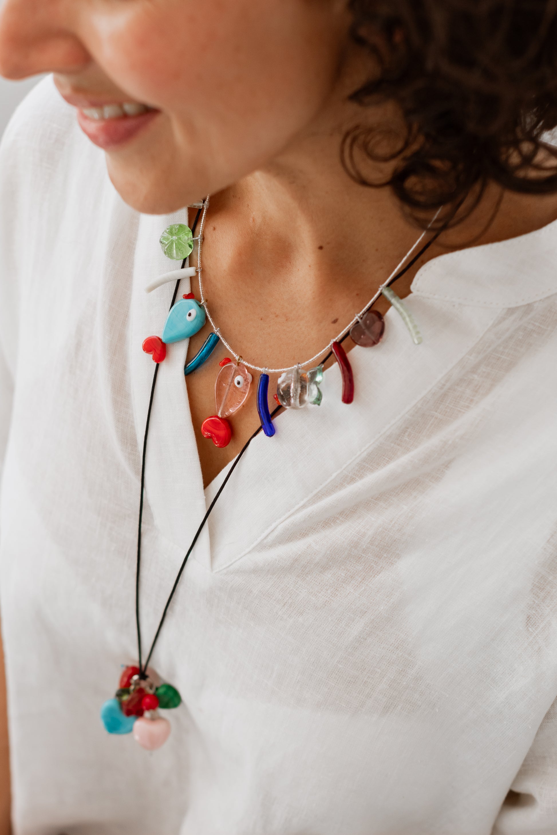 Colar curto, peixes, contas e miçangas de vidro,