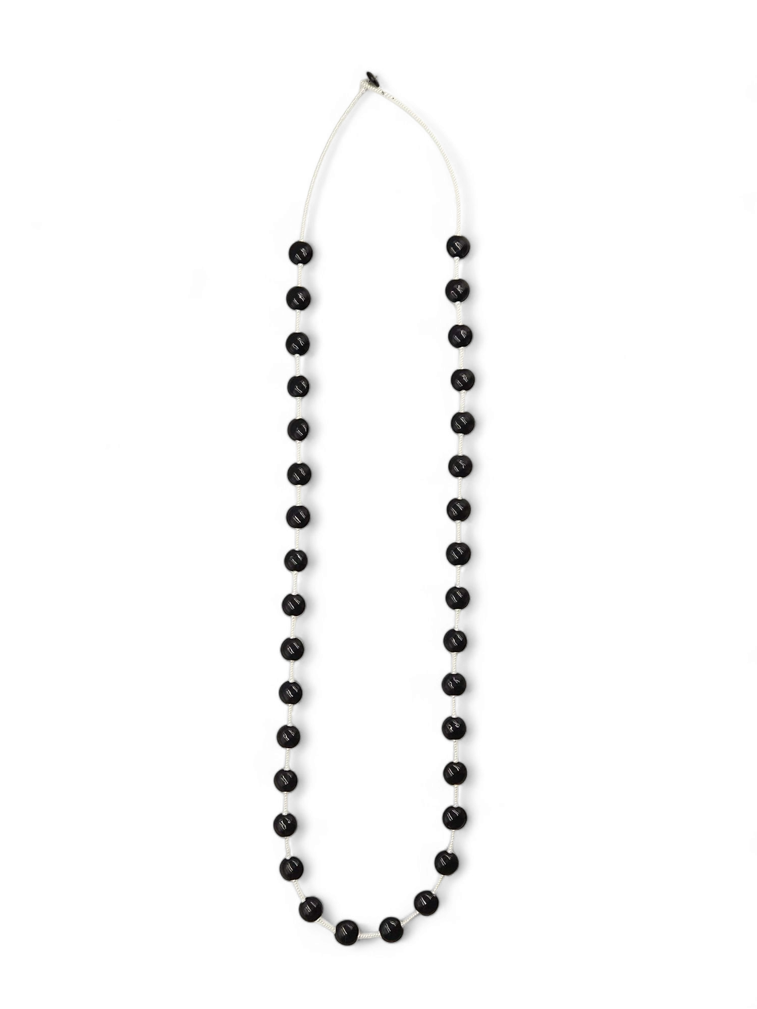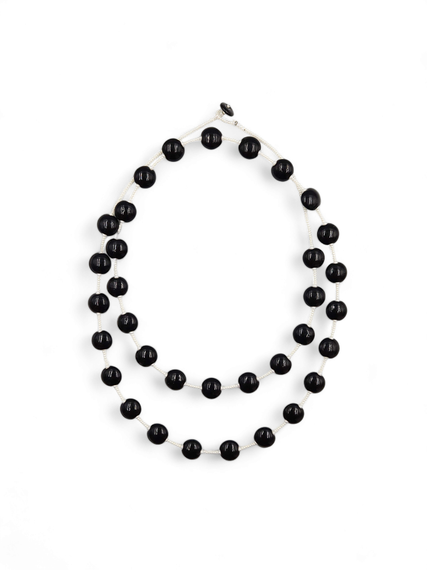 Colar longo, contas de vidro preto modelado no fogo e miçangas peroladas da República Tcheca.