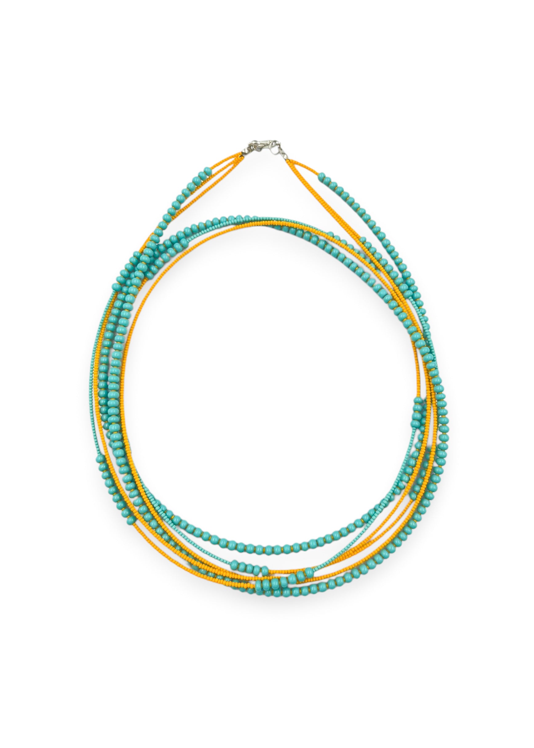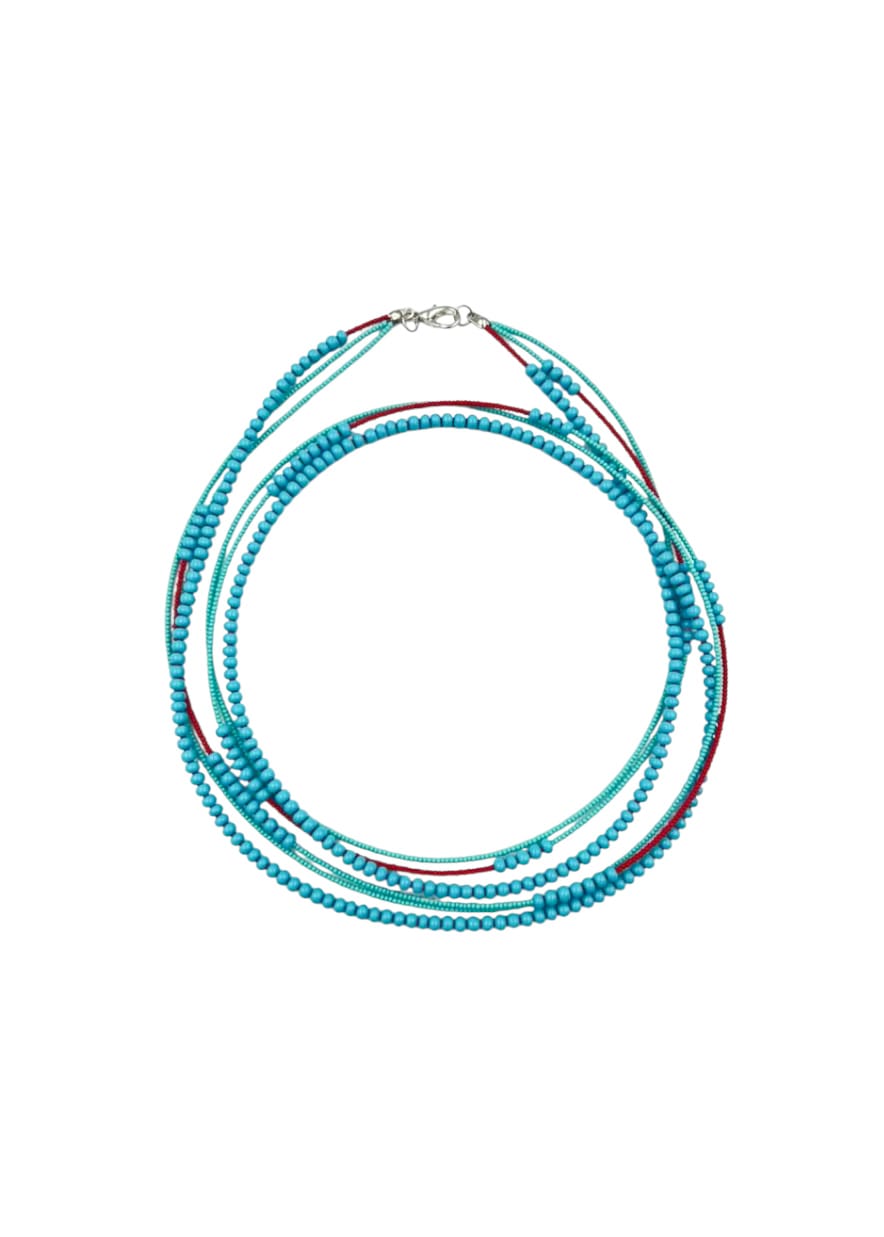 Colar longo com três voltas, miçangas e contas de vidro coloridas da República Tcheca, fecho mosquetão.